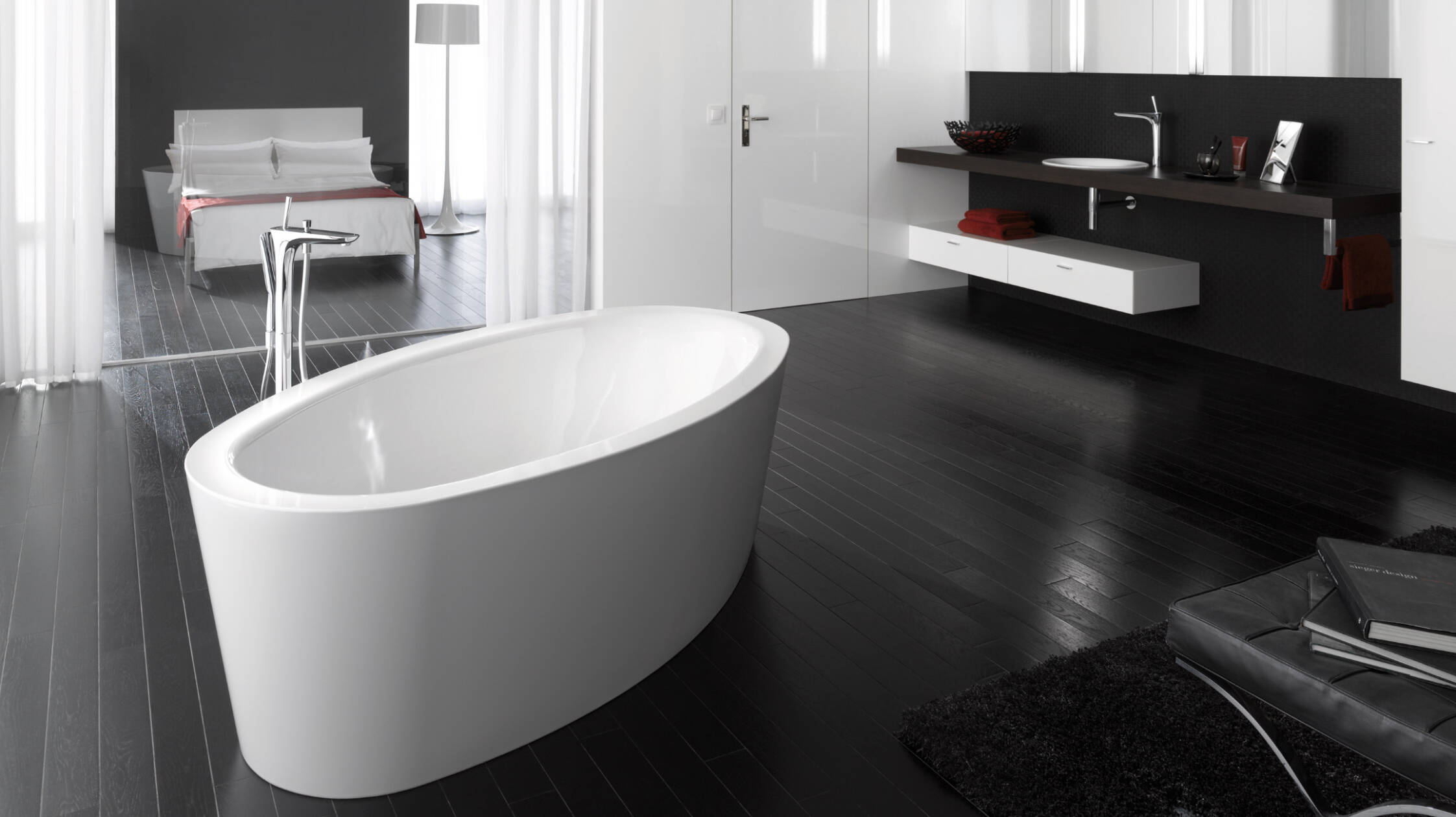 Sie planen einen modernen Neubau oder eine hochwertige Renovierung und begeistern sich für ein harmonisches Gleichgewicht der Kontraste? Entscheiden Sie sich für ein duales Farbkonzept, und gestalten Sie ein Bad in Schwarz-Weiss. Eine Einrichtung in puristischem Stil passt zum klaren Ambiente. Die reizvolle Spannung zwischen präzisen Linien und sanft gerundeten Formen unterstützt die Farbpolarität. Auf dunklen Bodendielen kommt eine freistehende Wanne in der Raummitte perfekt zur Geltung. Ihre weiss strahlende Fläche verspricht haptisches Vergnügen, und die leicht geschwungene Form lädt zu entspanntem Wassergenuss ein. Am Waschtisch bilden schwarze und weisse Badmöbel ein elegantes Ensemble. Die Grenze zwischen funktionaler Badeinrichtung und exklusivem Mobiliar verschwimmt. Ein Sitzplatz mit schwarzen Ledersesseln und der grosszügige Übergang ins ebenfalls schwarz-weiss gestaltete Schlafzimmer betonen den Wohncharakter.