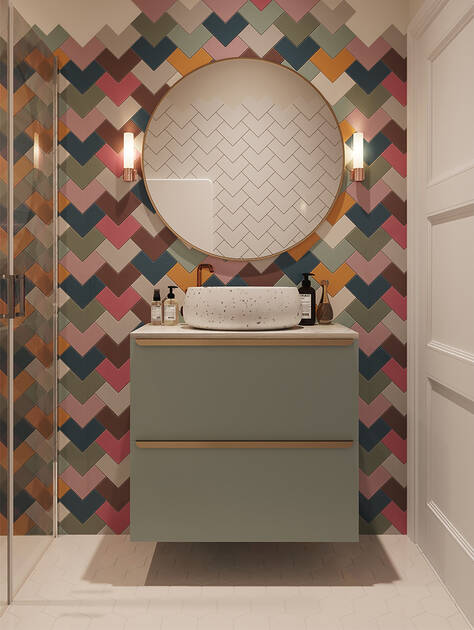 Exklusive Blickfänge sind: freistehende Wannen oder Waschbecken, kombiniert mit hoch aufragenden Mischern (Highrisern). Ein Duschbereich mit einer grossen, rundum belebenden Regendusche. Eine Waschschüssel mit raffinierter Knopfdruck-Armatur. Ein eleganter Designheizkörper für Handtücher. Wer Muster und Materialmixe liebt, tobt sich bei den Fliesen aus: bunte Mosaiken, orientalische, geometrische oder florale Verzierungen. Gold mit Marmor, Glas mit Stein, coole Flächen in Schwarz/Weiss oder Hell/Dunkel. Kontrastreiche Farben, Materialien und Texturen bringen Glamour ins Bad.